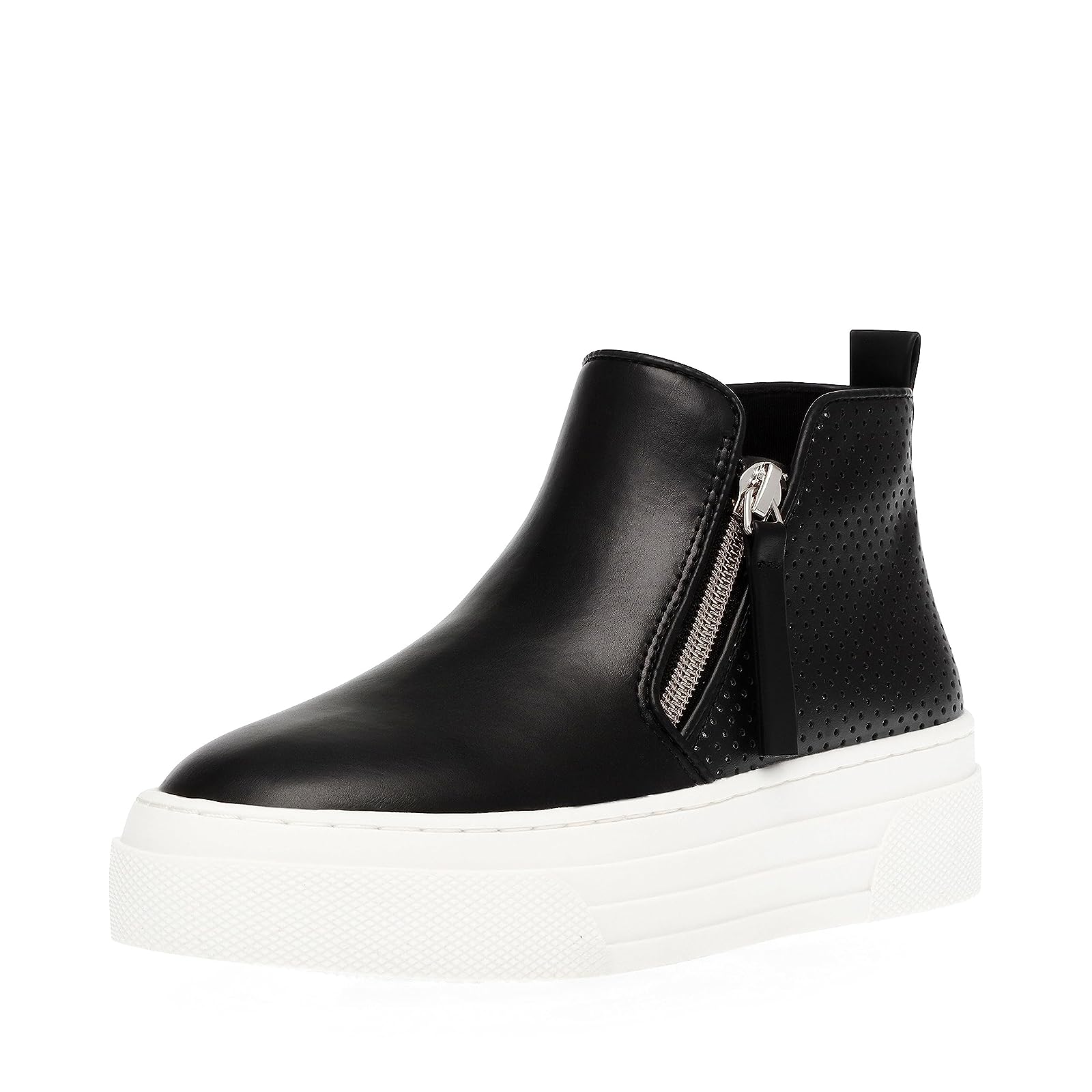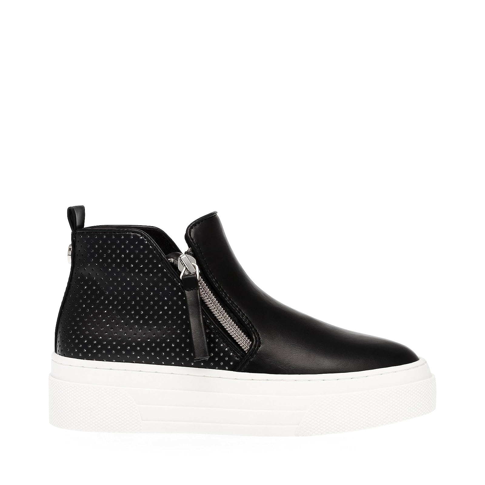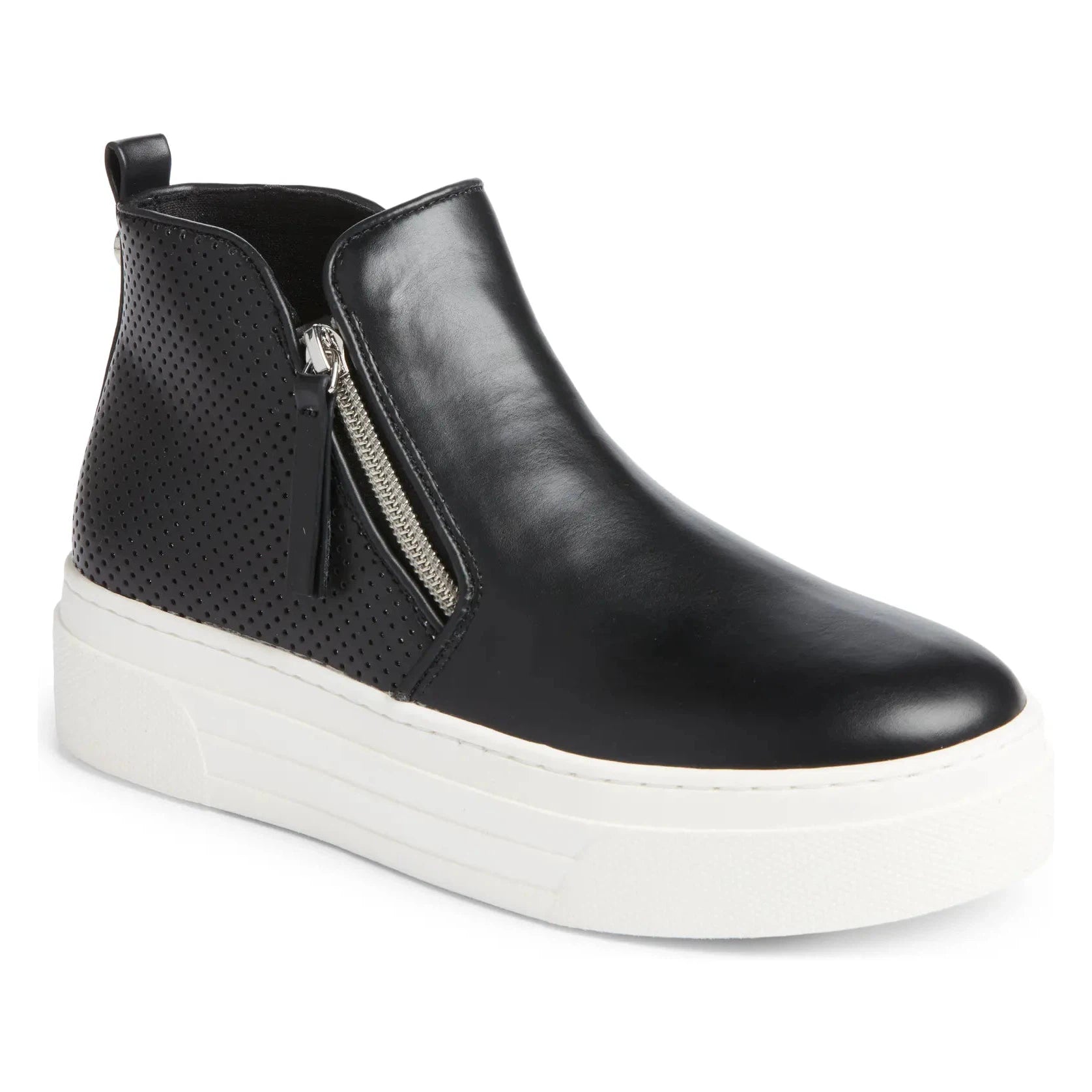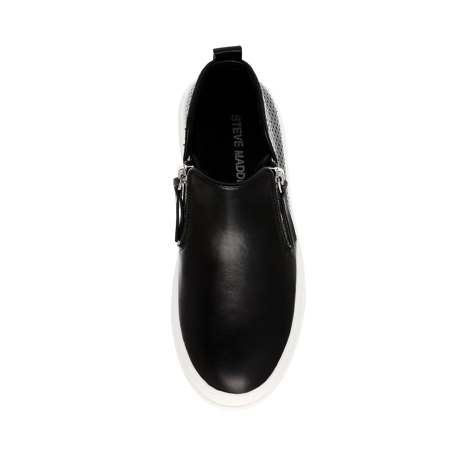 Bring on the missing shine and shimmer to your younger one's look by complementing it with the Steve Madden® Kids Hummon Sneakers. With a high-top bootie construction, the shoes display a polished synthetic upper with rhinestone-embellished panels, a breathable textile lining, and a comfort padded textile insole.