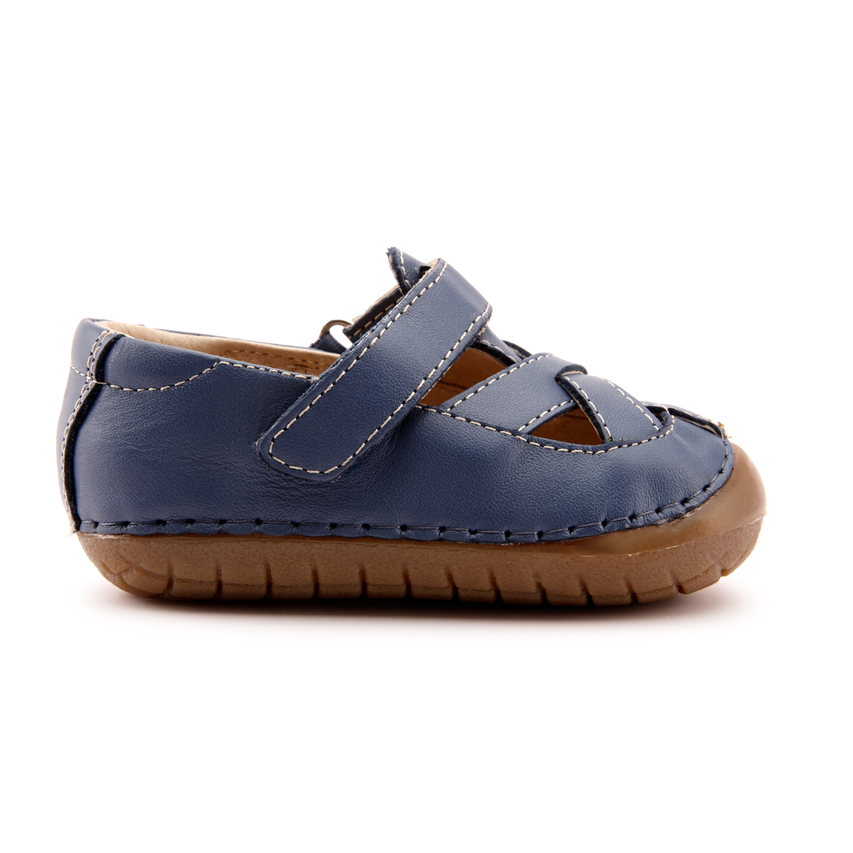 Sneakers with genuine leather upper and crisscross cut out design. Adjustable velcro closure. Lightly padded collar. Soft leather lining and footbed. Toe Bumper. Rubber sole.