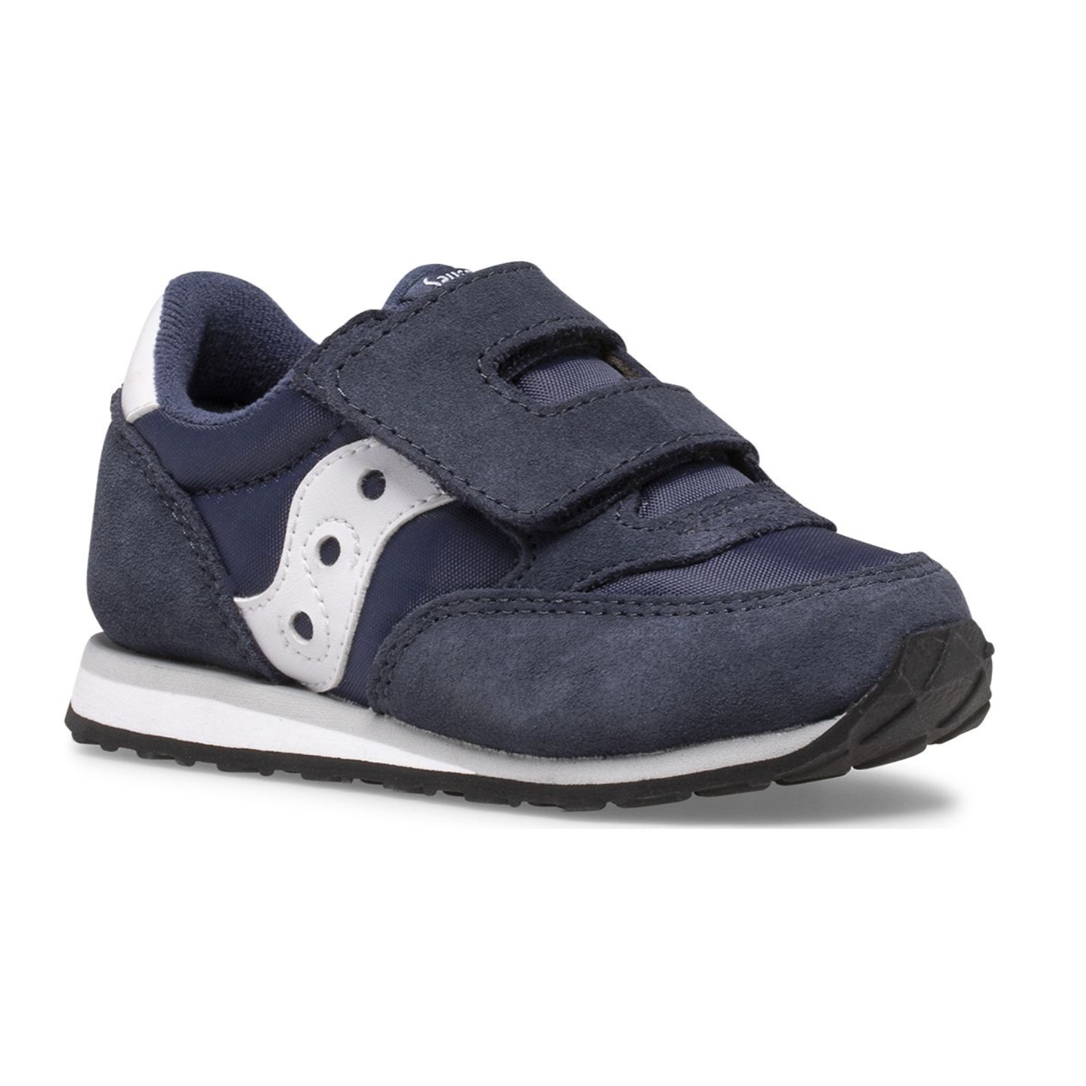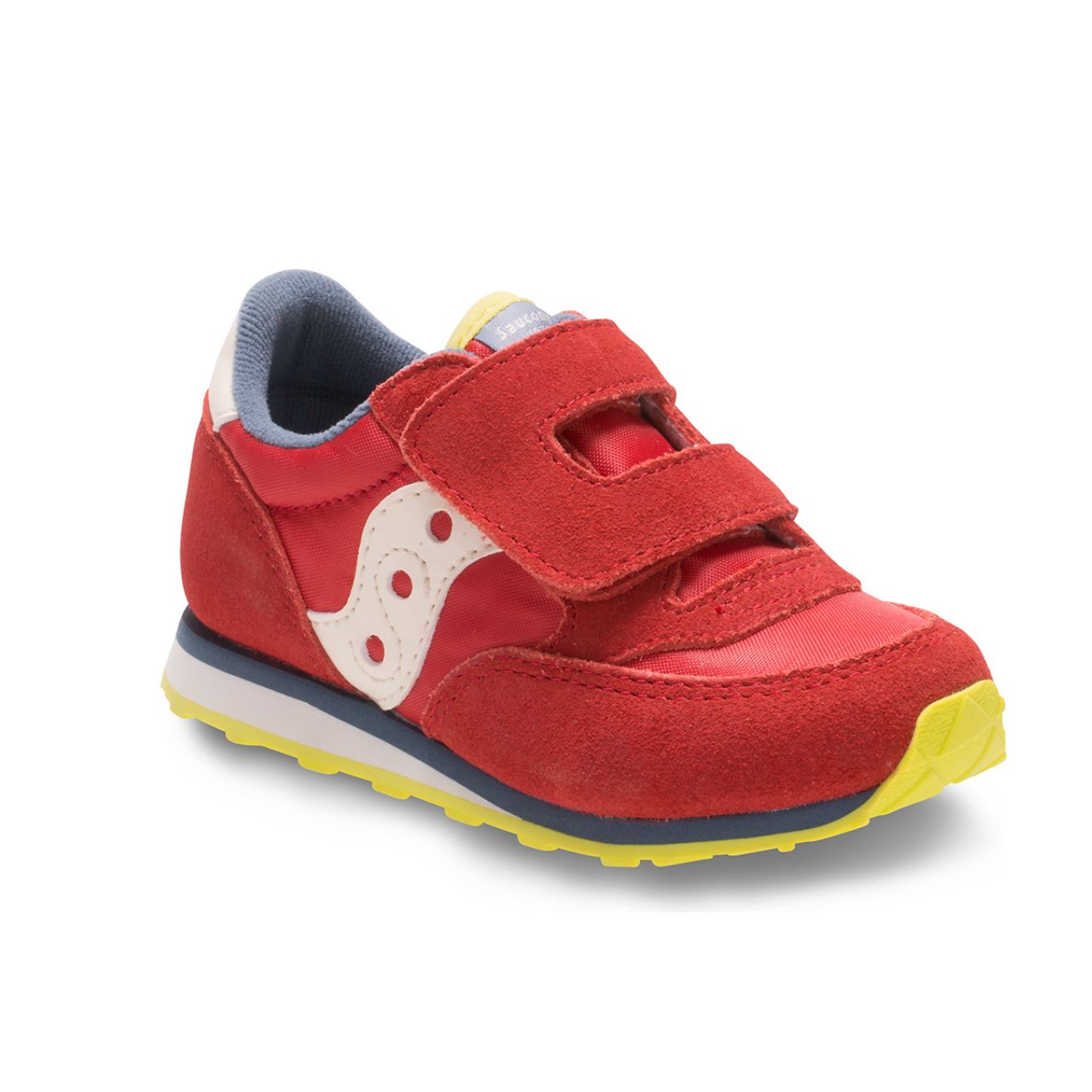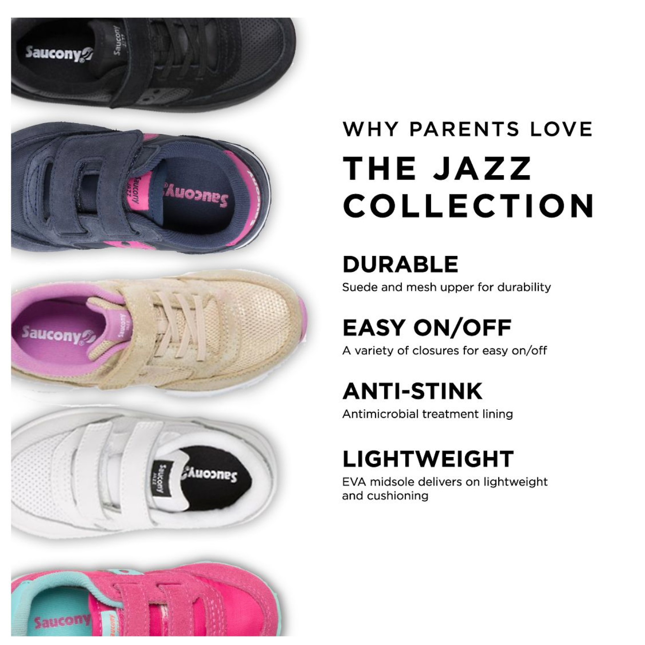 Now you and your baby can have matching Saucony Originals! The Saucony Jazz hook-and-loop offers extreme comfort and that effortlessly cool look that never goes out of style. A rubber outsole with triangular lugs provides traction and flexibility for a comfortable, smooth ride. Fun colors and easy closures have made the baby Jazz the ultimate first shoe.