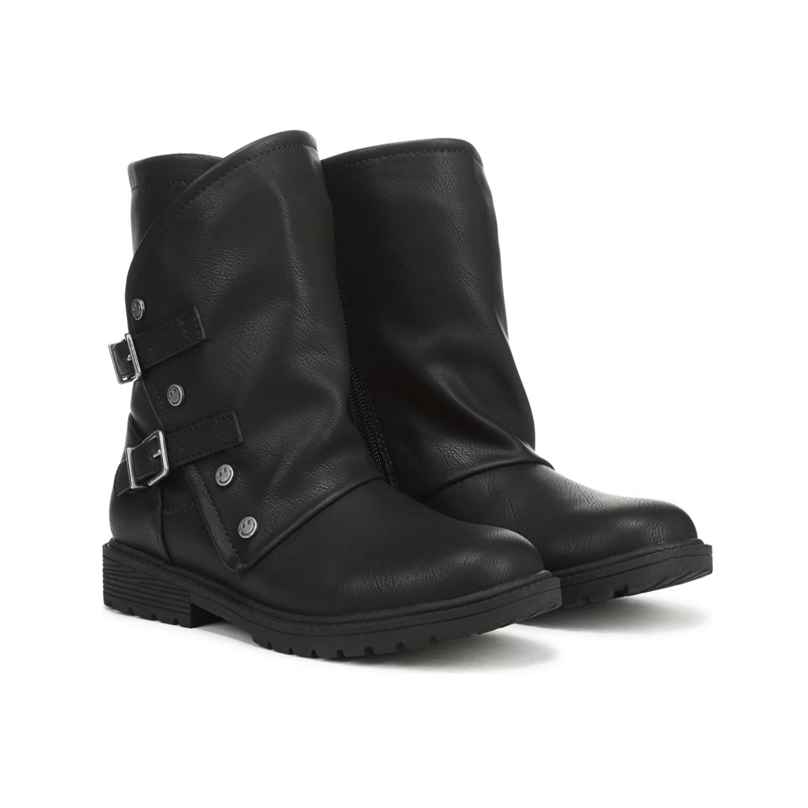 Give their outfit some moto-chic style with the Kids' Blowfish Malibu Rylee Moto Boot. Featuring a sleek faux-leather upper, double buckle details, and an easy inside zipper, this everyday boot is both stylish and practical. A cushioned insole keeps things comfy, while the durable outsole stands up to active little feet.