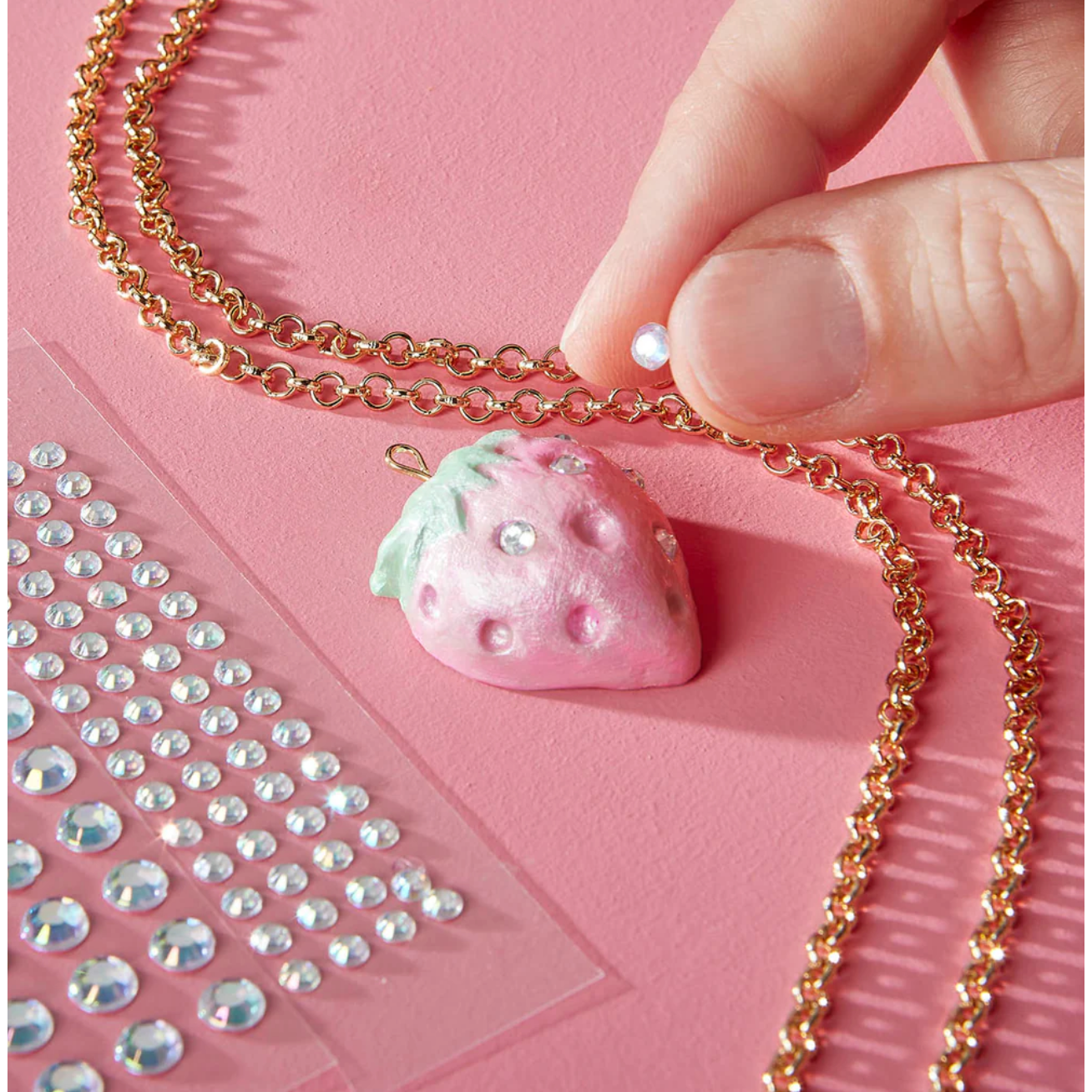 Create your own boutique-worthy jewelry with the Wish*Craft Clay Jewelry Kit! Sculpt and paint air-dry clay charms, then decorate them with real crystals, metal charms, and pearlized paints. Finish with a shiny glaze for durability and attach your designs to gold chains, bracelets, or earrings. Everything you need for endless creativity is included—just mold, paint, and wear!