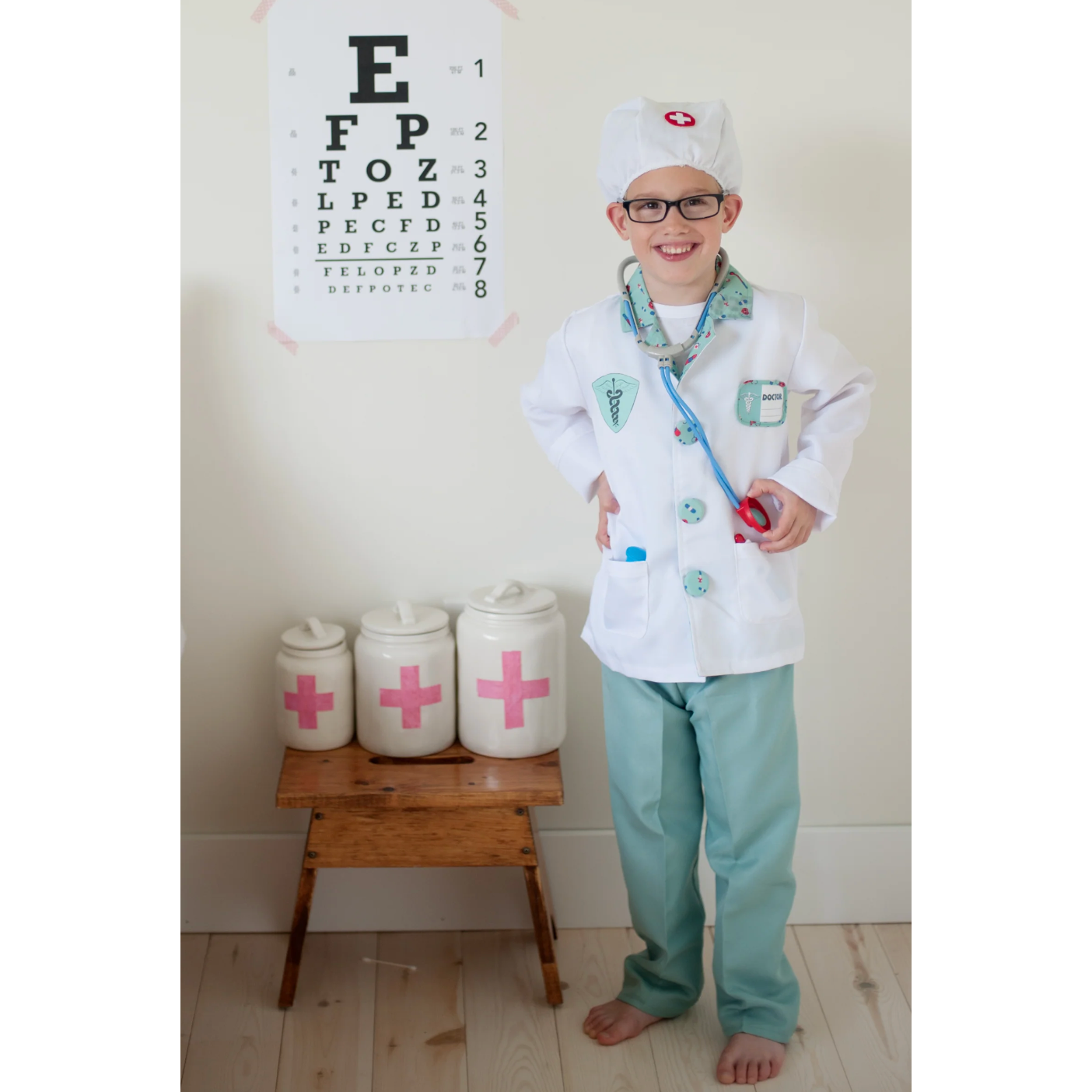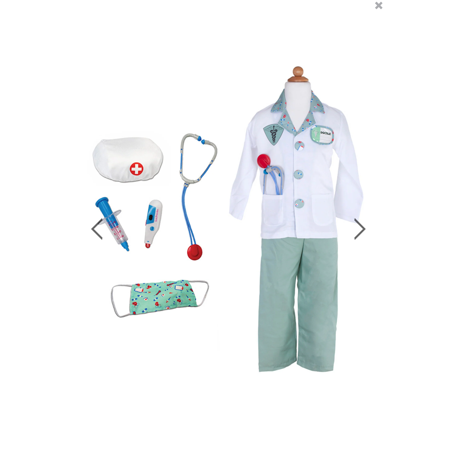 The doctor is in! Look the part in this complete ensemble as you diagnose and treat pretend patients with this 8 piece dress-up-and-play set. The set includes a white doctor's coat, green scrub pants, a green fabric mask, white hat, play stethoscope, play syringe, and play thermometer. The coat also features a sewn in doctor's name tag holder with removable name tag and Velcros on and off. All our Great Pretenders Career Costumes are packaged in a reusable blue garment bag for easy storage. 8 Piece Set: Lab coat, pants, mask, hat, stethoscope, syringe, name tag and thermometer