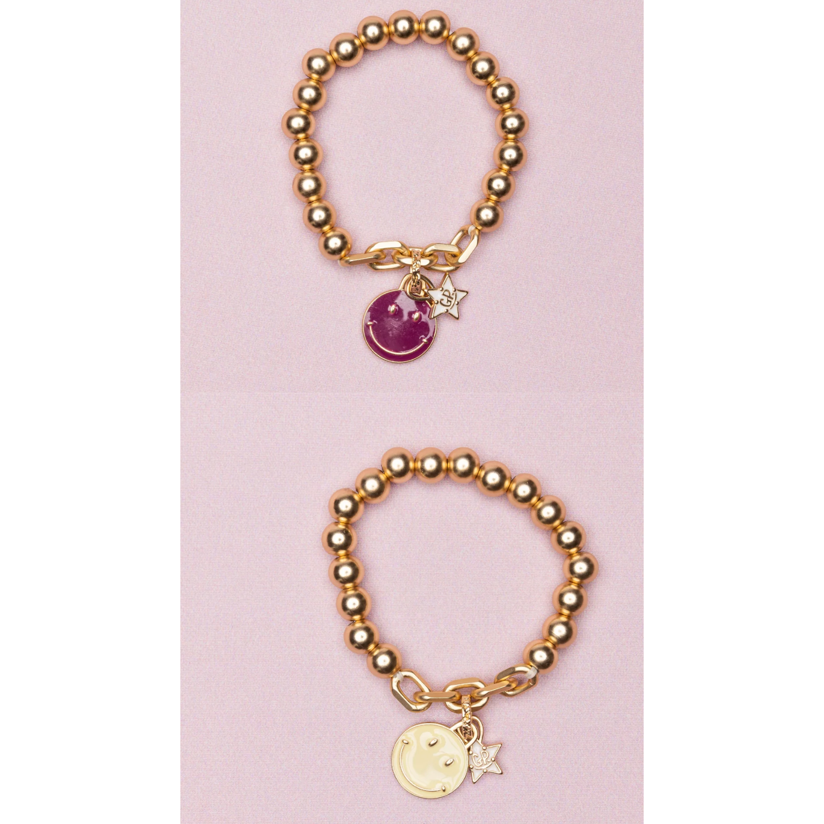Meet the Boutique Chic Happy Days Bracelet, a charming duo of gold beaded bracelets that will elevate your wrist with a touch of charm. Each bracelet is adorned with a large smiley face charm, spreading positivity and joy wherever you go. One side is purple the other side is yellow- what a charming color combo! pic shower either side of the bracelet