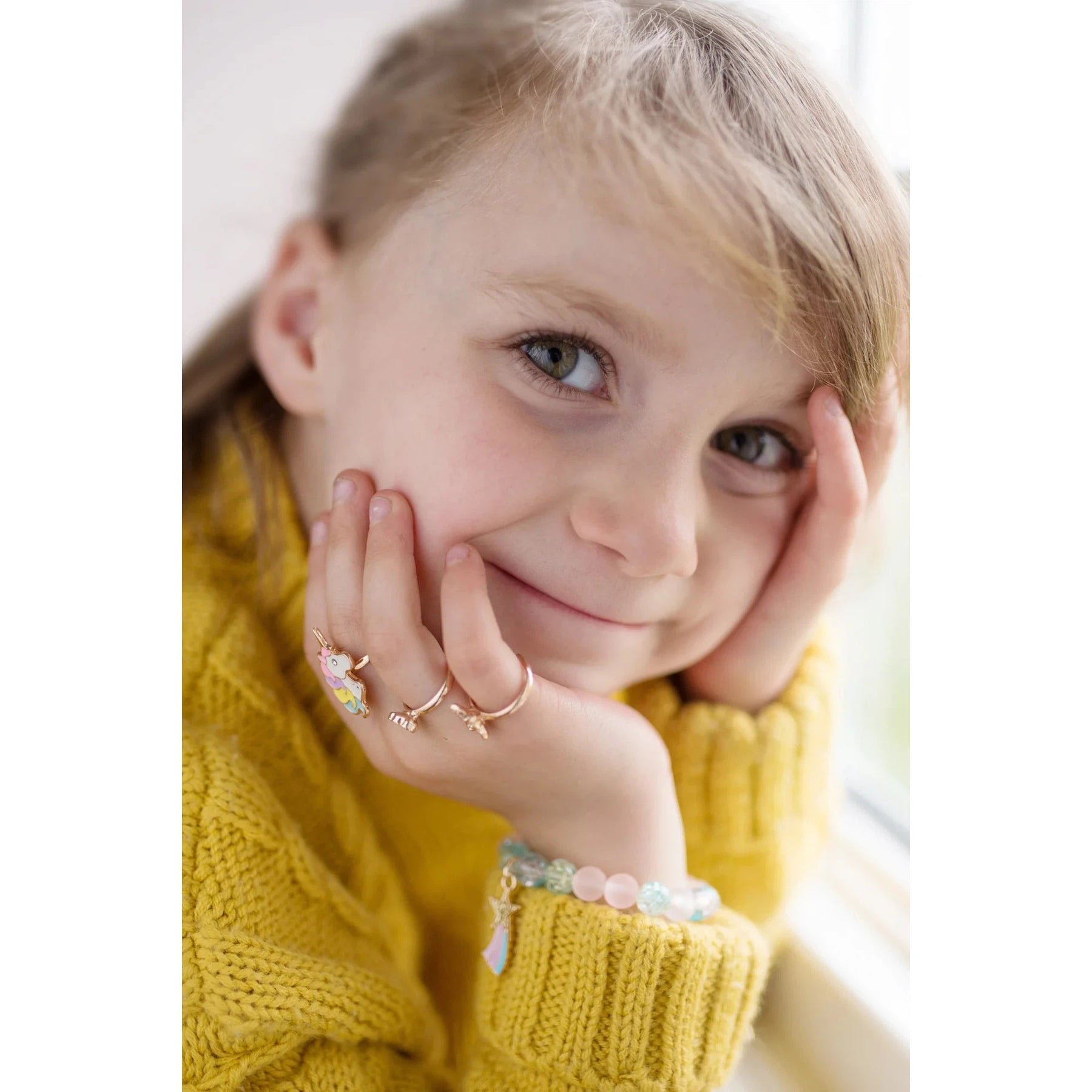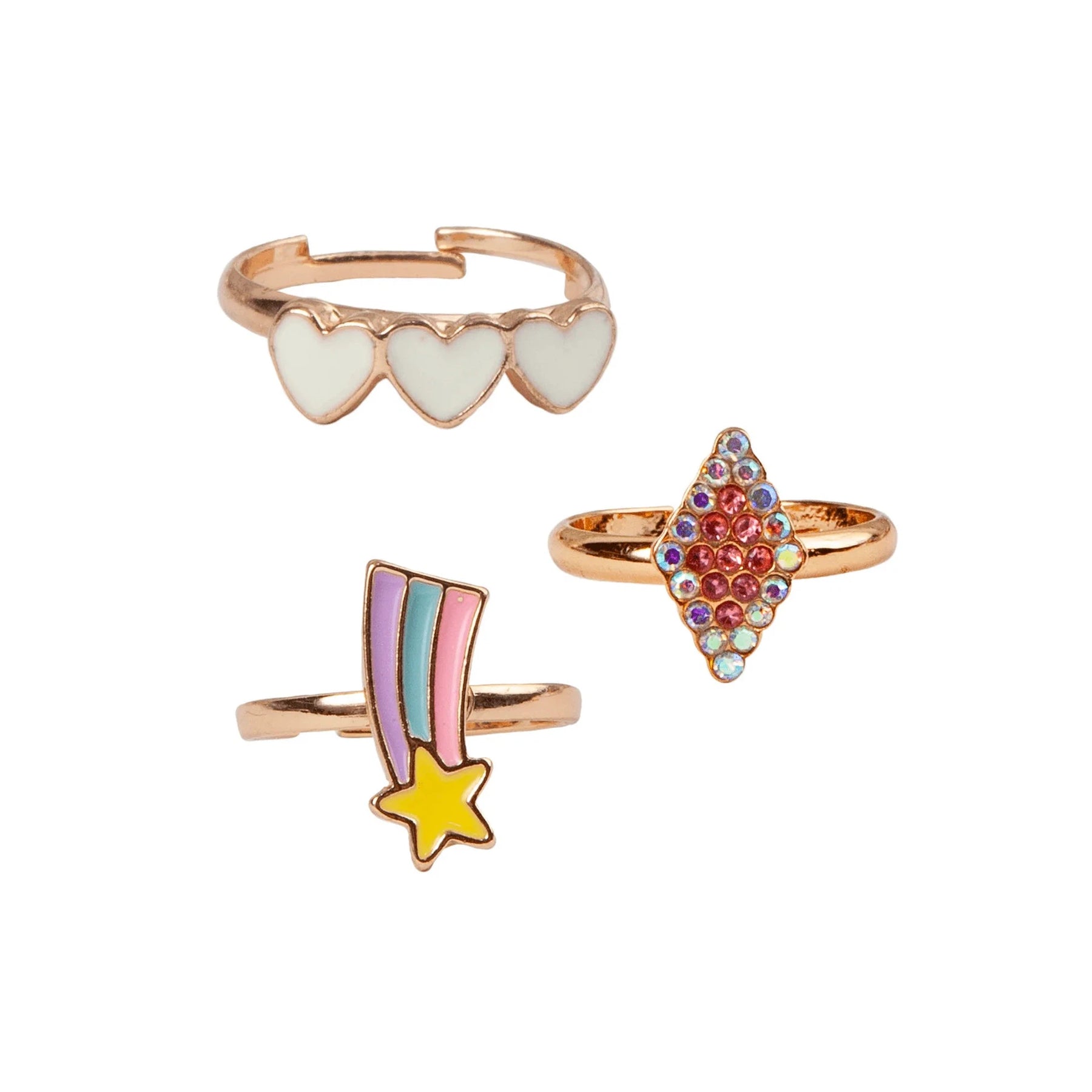 Three rose-gold toned rings made just for you! This adjustable set includes a shooting star, diamond, and triple heart-shaped ring for pretend play or everyday wear.