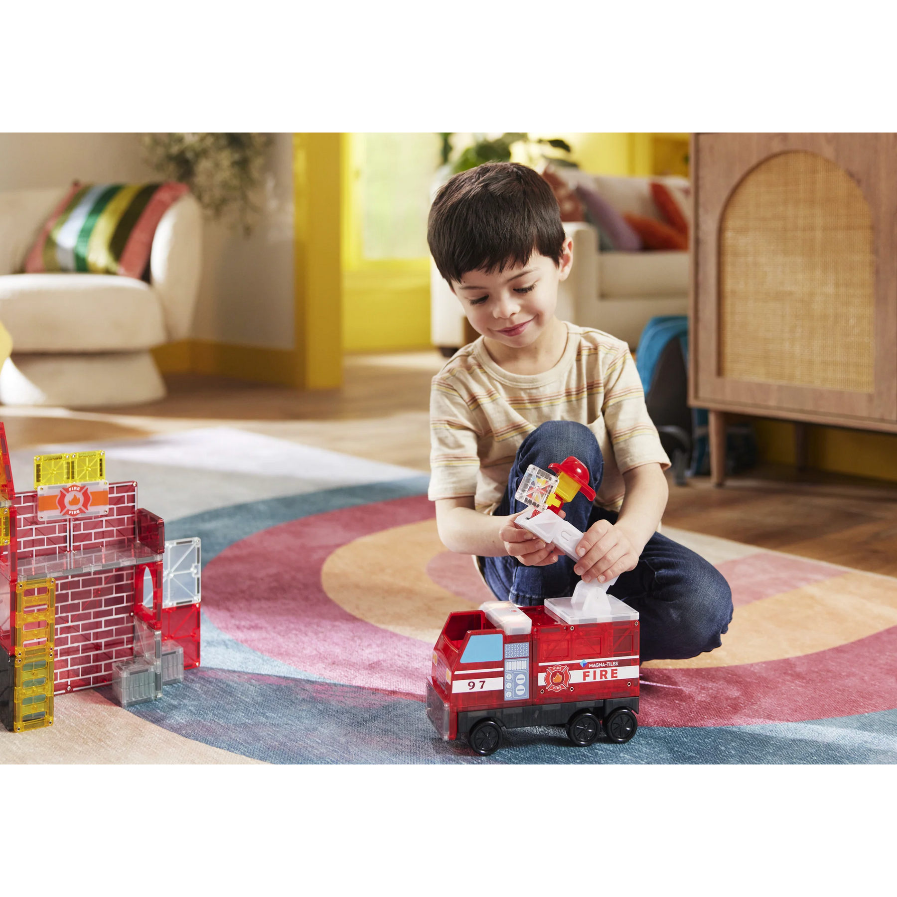 Step into action with the MAGNA-TILES Fire Station™ 50 Piece Set! Build custom rescue vehicles using the modular Fire Truck with its extendable ladder to reach high places. The Light & Sound Tile adds flashing lights and a siren for an exciting firefighting adventure. Includes a Firefighter Figure and magnetic Dalmatian companion. Use microMAGS Cubes, attachable Fire Tiles, ladders, and fences to create thrilling rescue scenes. This set sparks imagination and lets every child become the hero of their own MAGNA-TILES world! Perfect to pair with the MAGNA-TILES Police Station for even more fun.