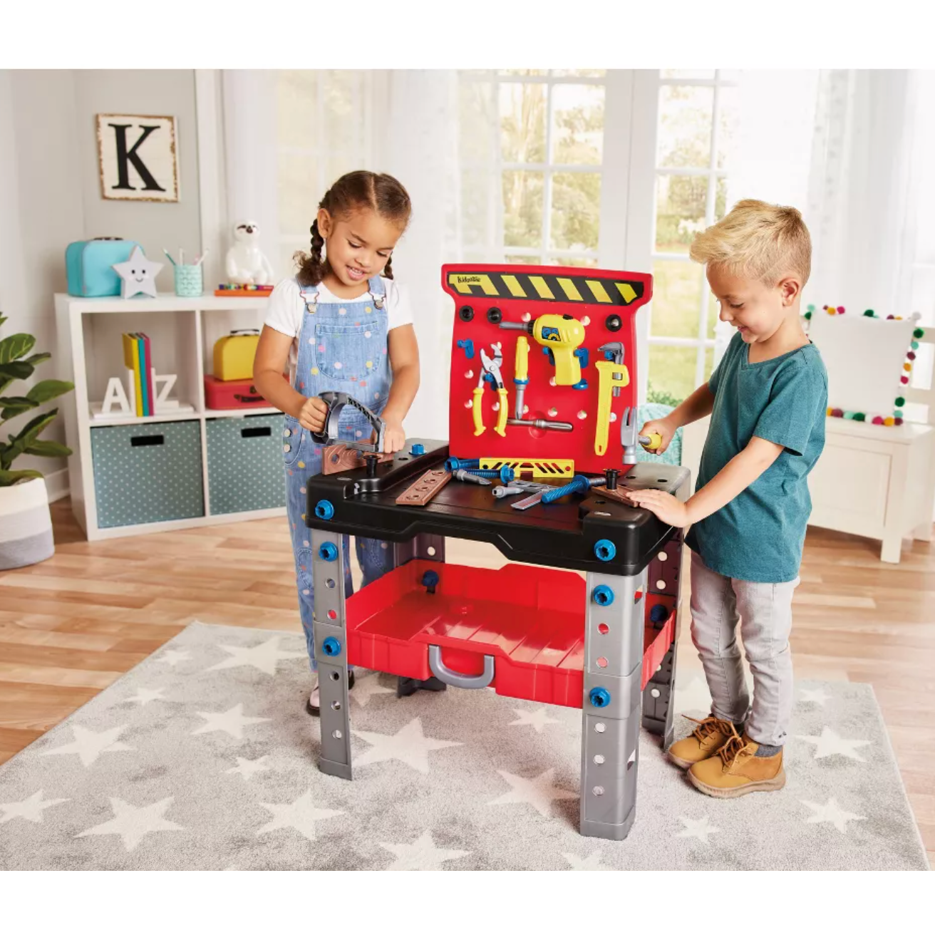 This Kidoozie Just Imagine Pack 'n Go Workbench provides hours of pretend play. It includes a workbench, 50+ tools and accessories, and a battery-operated drill with interchangeable tips and sound action. Made with durable materials, this set is recommended for children ages 3+ and requires 1 x C battery (not sold separately).