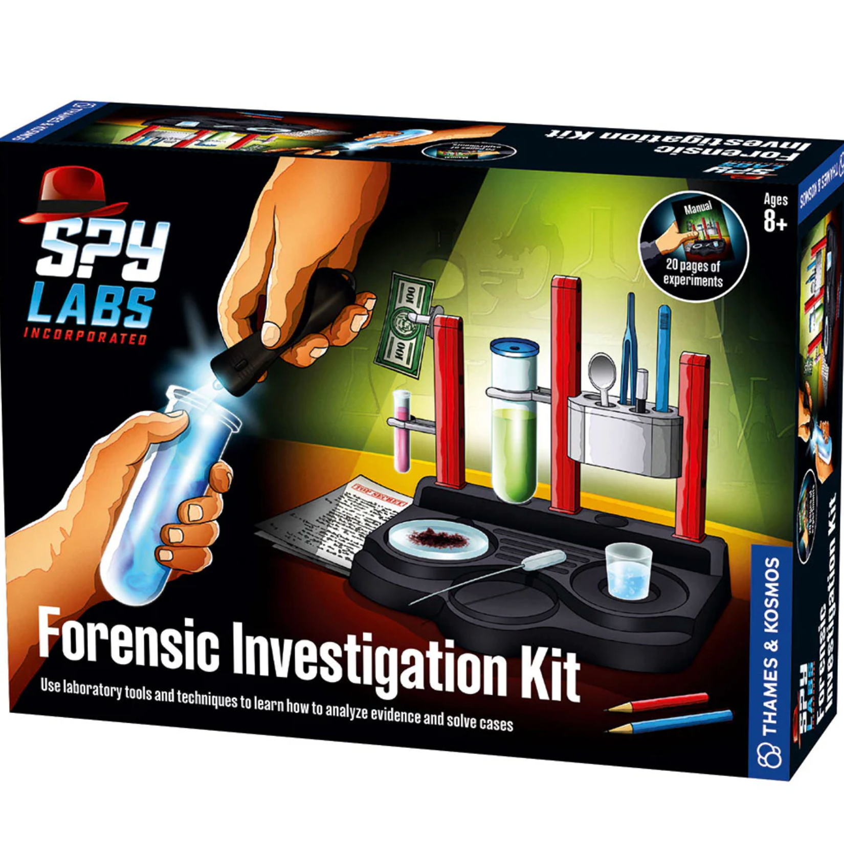 • Discover hidden secrets with the UV flashlight, fingerprint powder, pH test strips, and more
