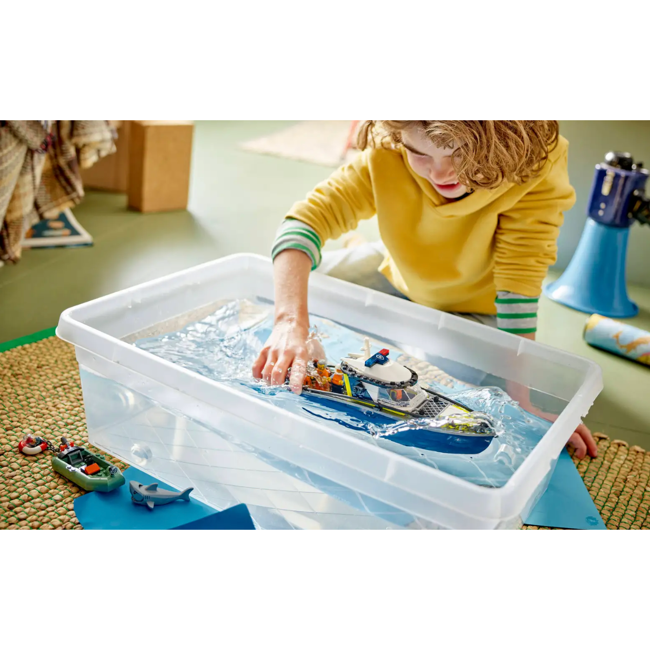 • 264 pieces – includes police boat, dinghy, 3 minifigures & shark