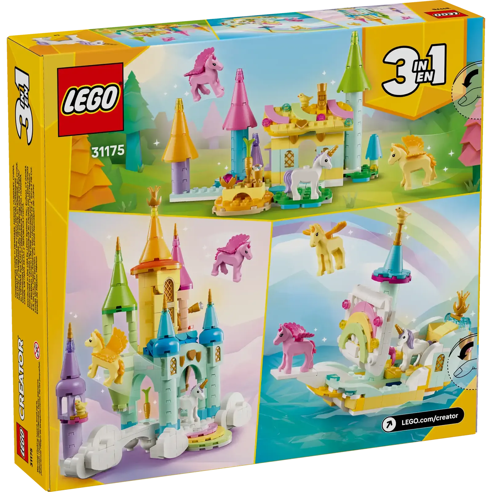 Build magical stories with the LEGO® Creator 3in1 Unicorn Castle (31175)! Kids 8+ can create a castle, ship, or playground with unicorn and Pegasus figures.