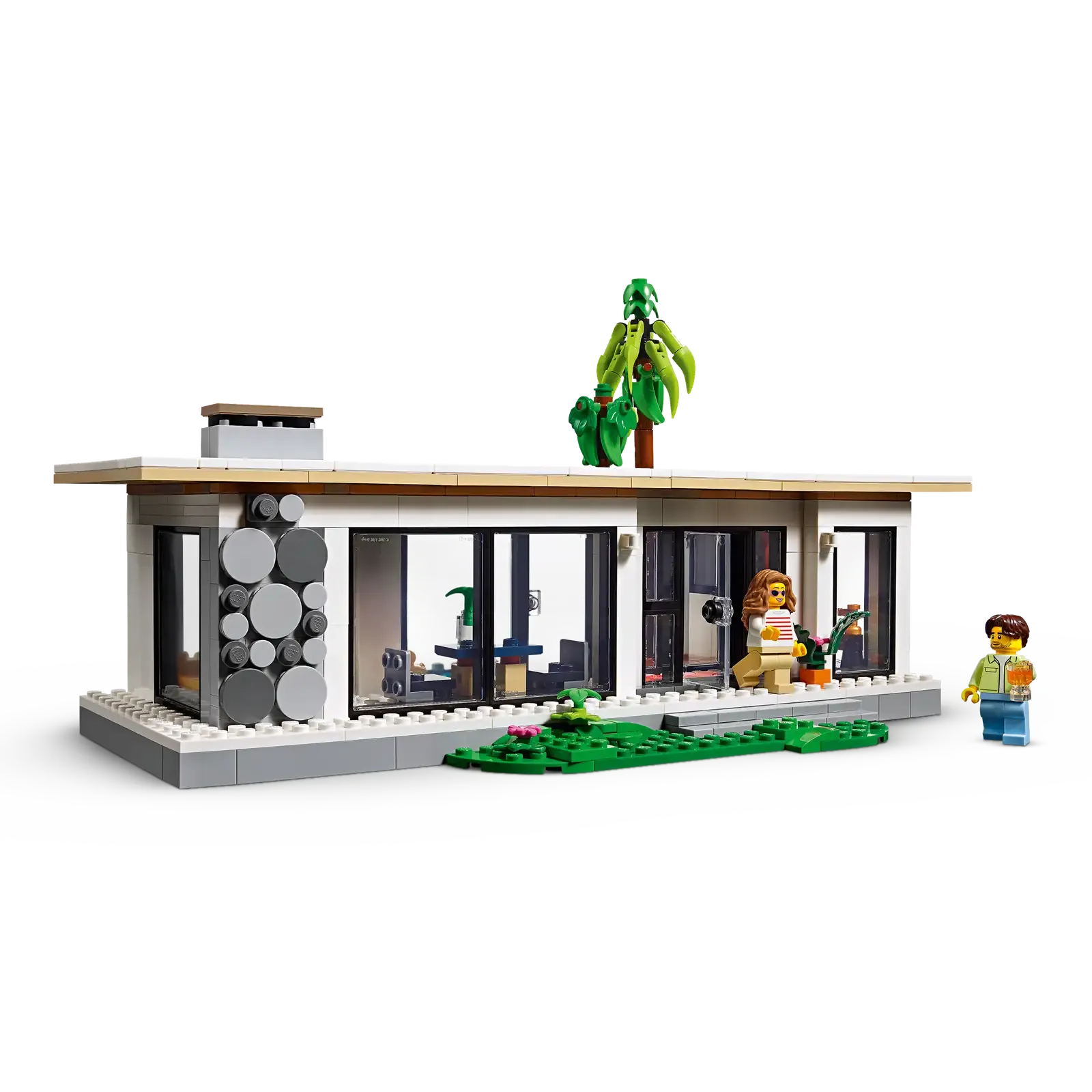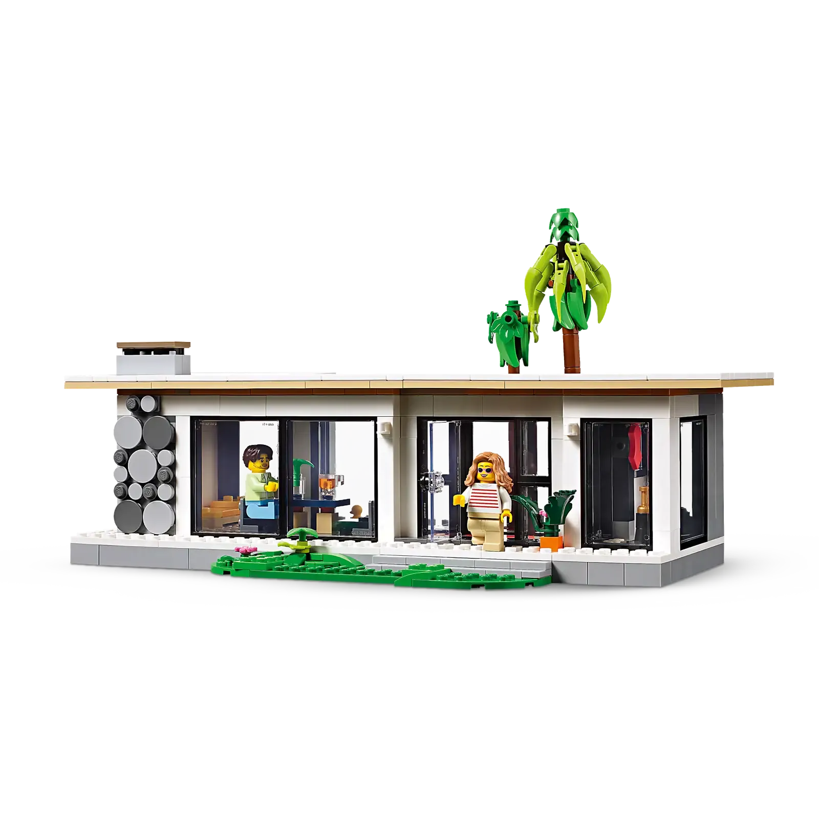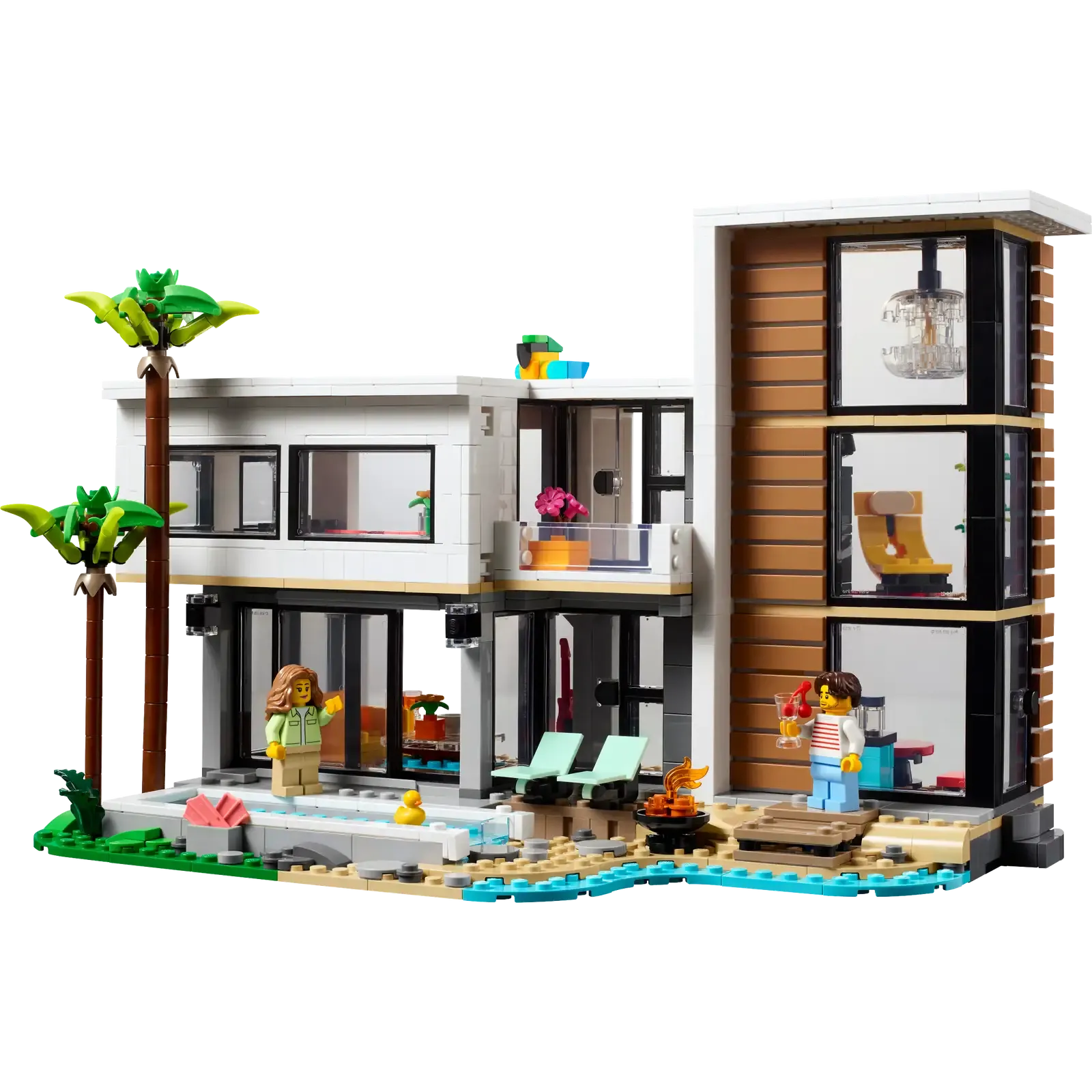 Build, rebuild, and dream big with the LEGO® Creator 3-in-1 Modern House! Perfect for kids 9 and up, this set transforms into a sleek beach house, a stylish 3-story city building, or a cozy forest cabin—all with the same bricks. Each model is packed with fun details like palm trees, rooftop terraces, and even a pool! With 2 minifigures and swappable outfits, the imaginative play never stops. Open backs and lift-up roofs make it easy to explore inside. Build it your way!