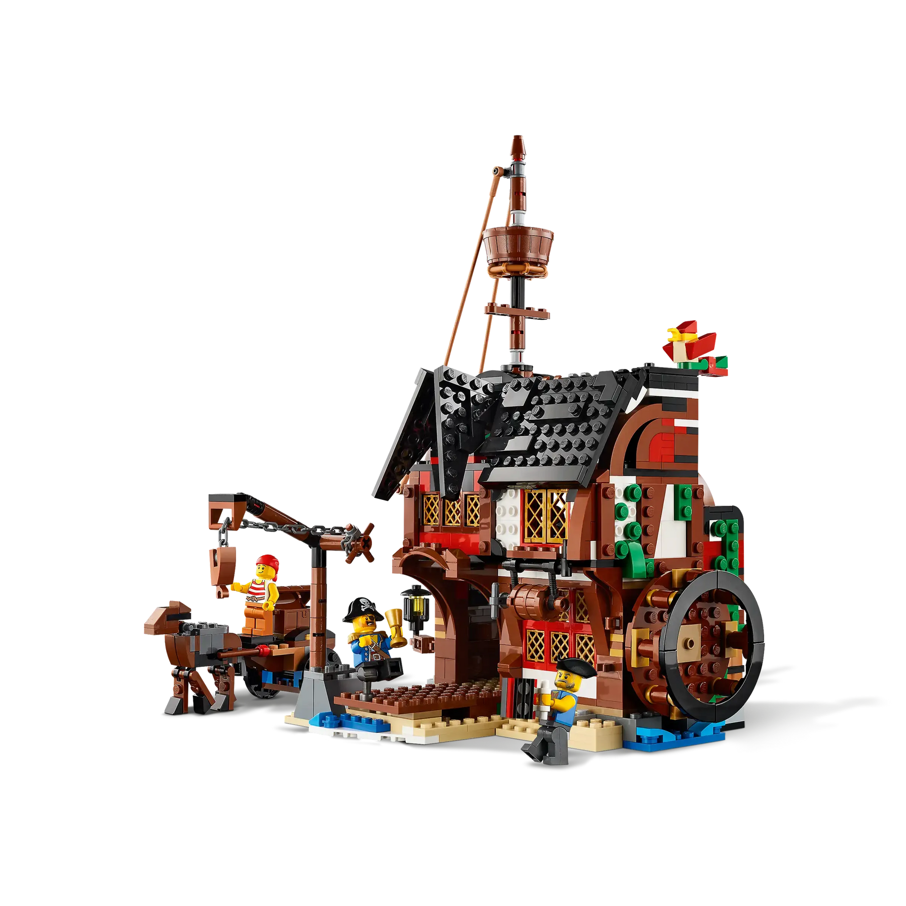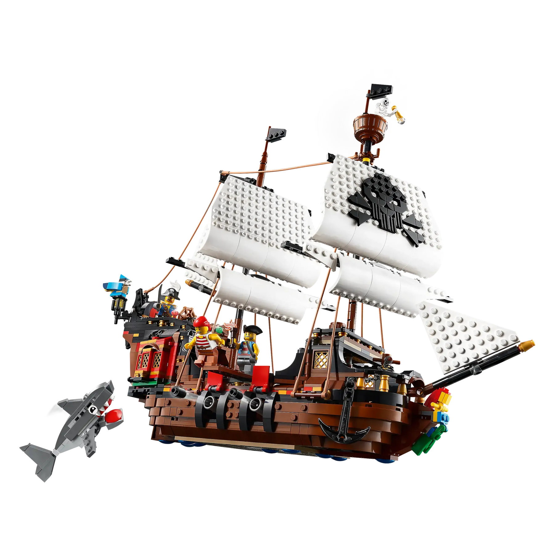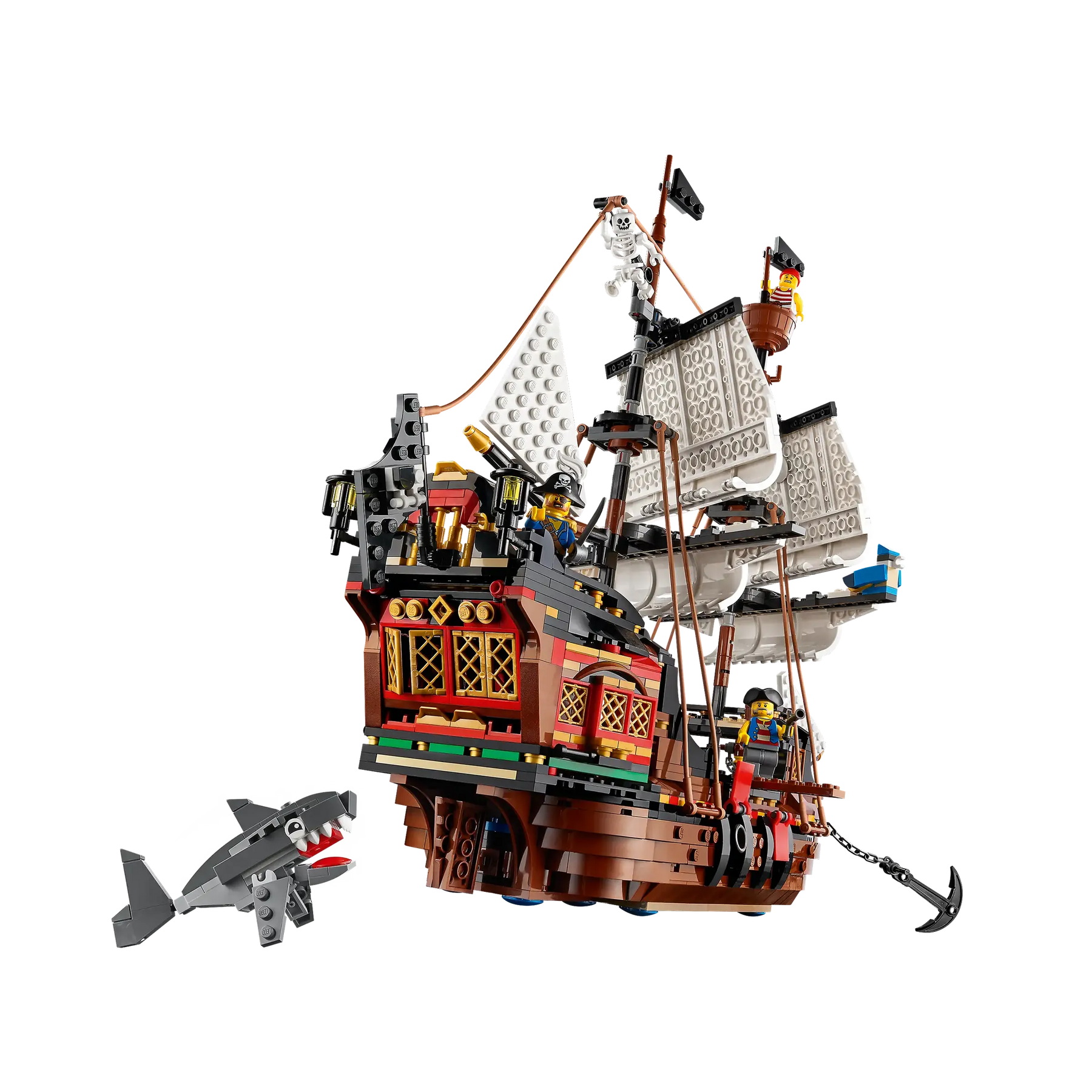 - Includes 3 Minifigures: Classic pirate crew plus buildable parrot and shark figures.