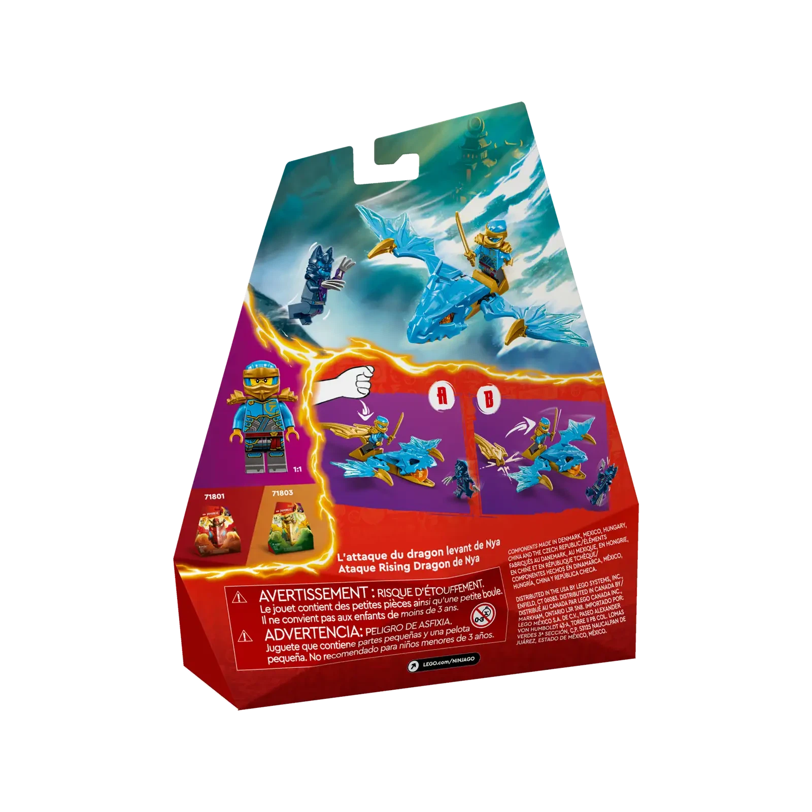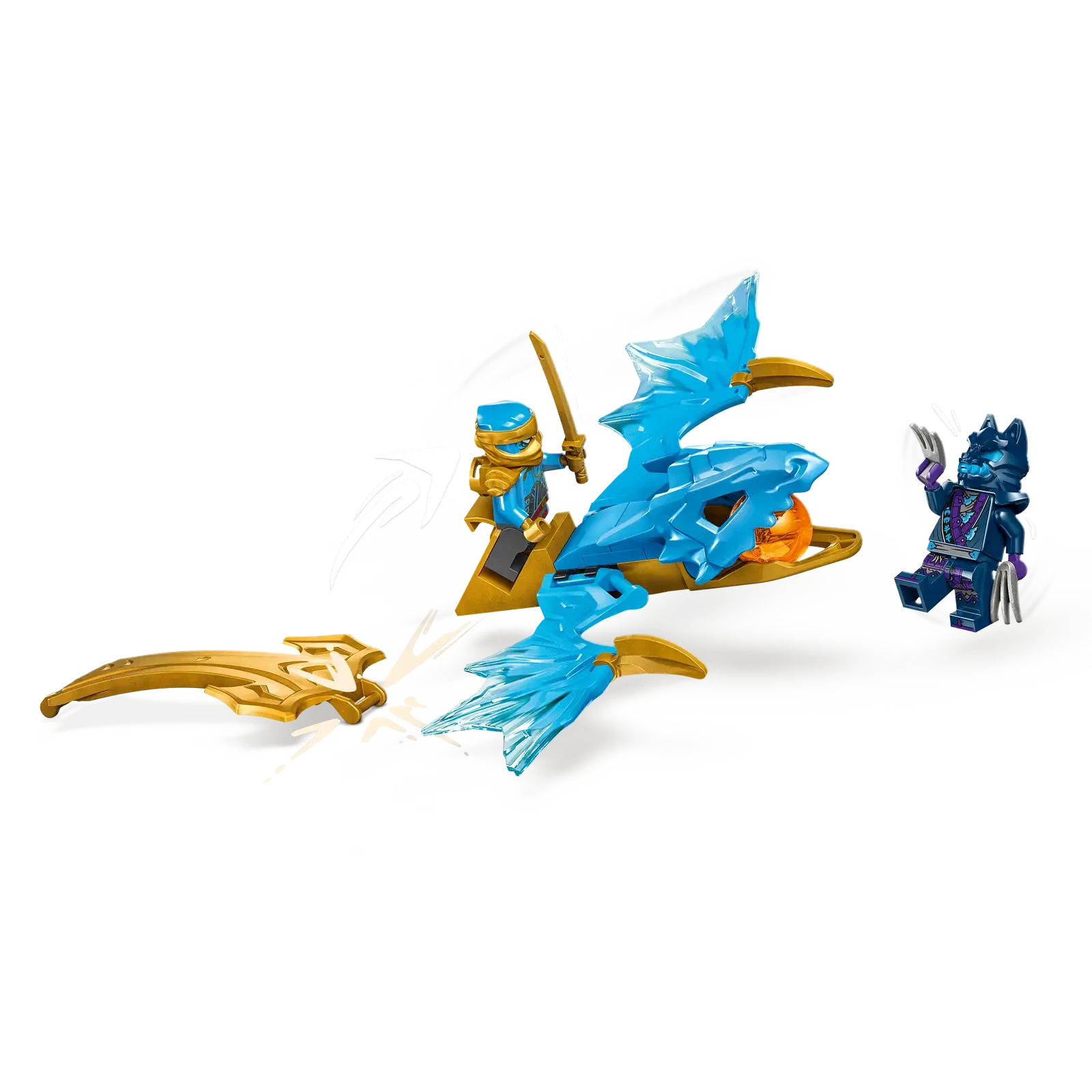 Imagine taking this building set and unleashing epic battles between ninja figures! Inside the blue dragon's posable mouth awaits an orange dragon power element, but watch out for the fierce Wolf Mask Claw Warrior with its razor-sharp claws. The fearless Rising Dragon Nya, equipped with a katana sword, can ride on the dragon model to defeat all foes. Only the most daring and skilled kids can master the NINJAGO® Nya's Rising Dragon Strike (71802)!