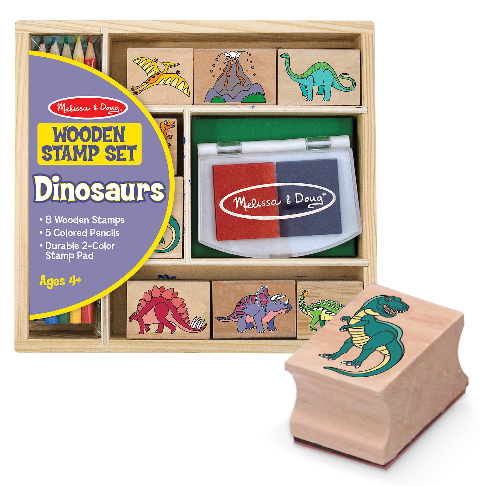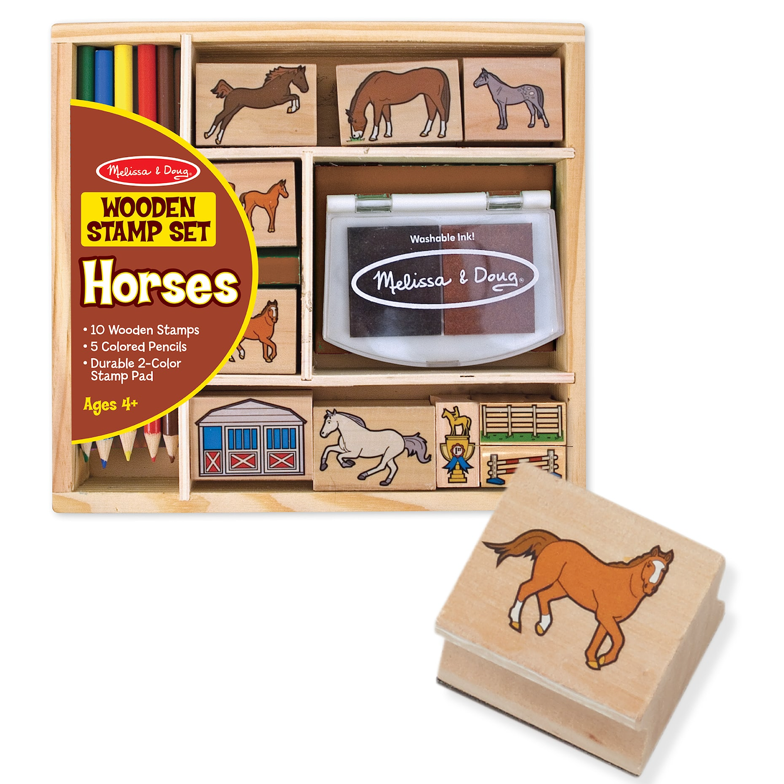Herd your horses with this detailed stamp set that includes a barn, corral, jump and six different horse stamps. Mix and match the detailed stamps to create hundreds of beautiful scenes. All the pieces, including the 2-color inkpad, store in a sturdy wooden box. Washable, non-toxic kid-friendly ink.