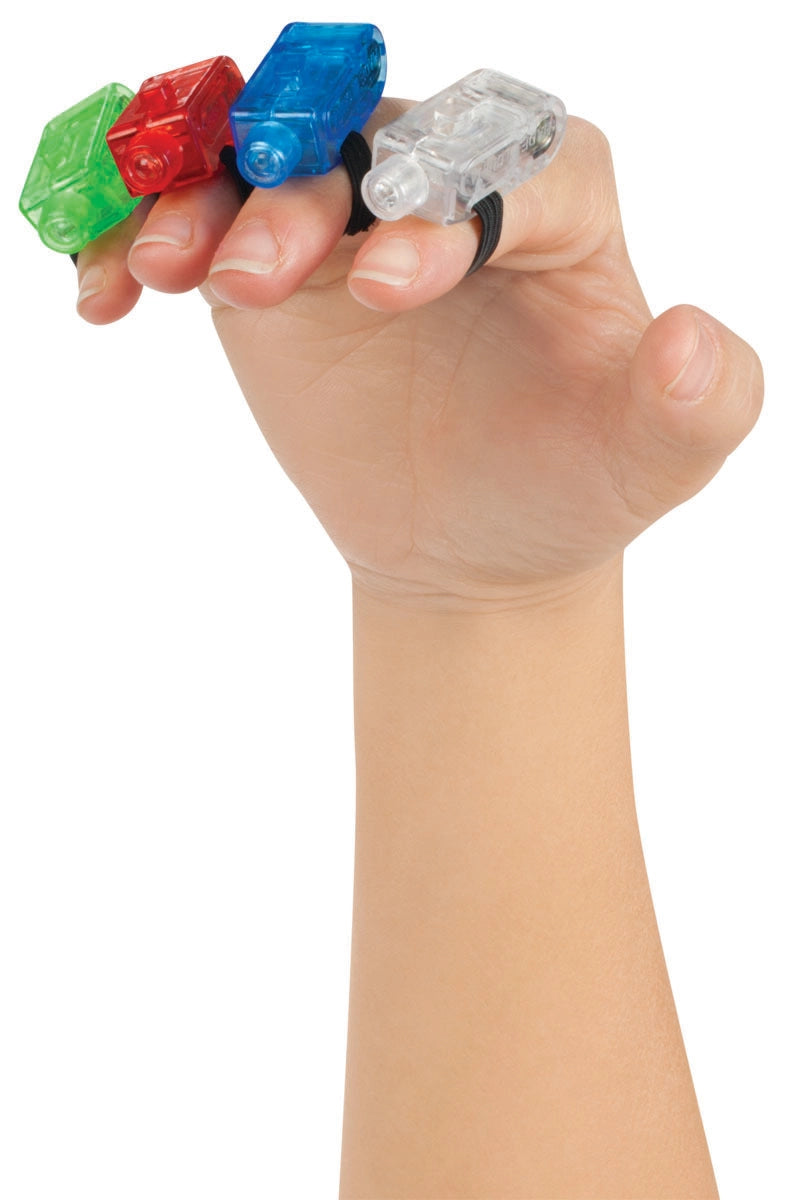 Create your own light show! These lasers fit right on your fingers, so you can create fun effects. Wear them all on one hand, or use both hands. 4 per package, each projects a different color. Includes non-replaceable batteries.