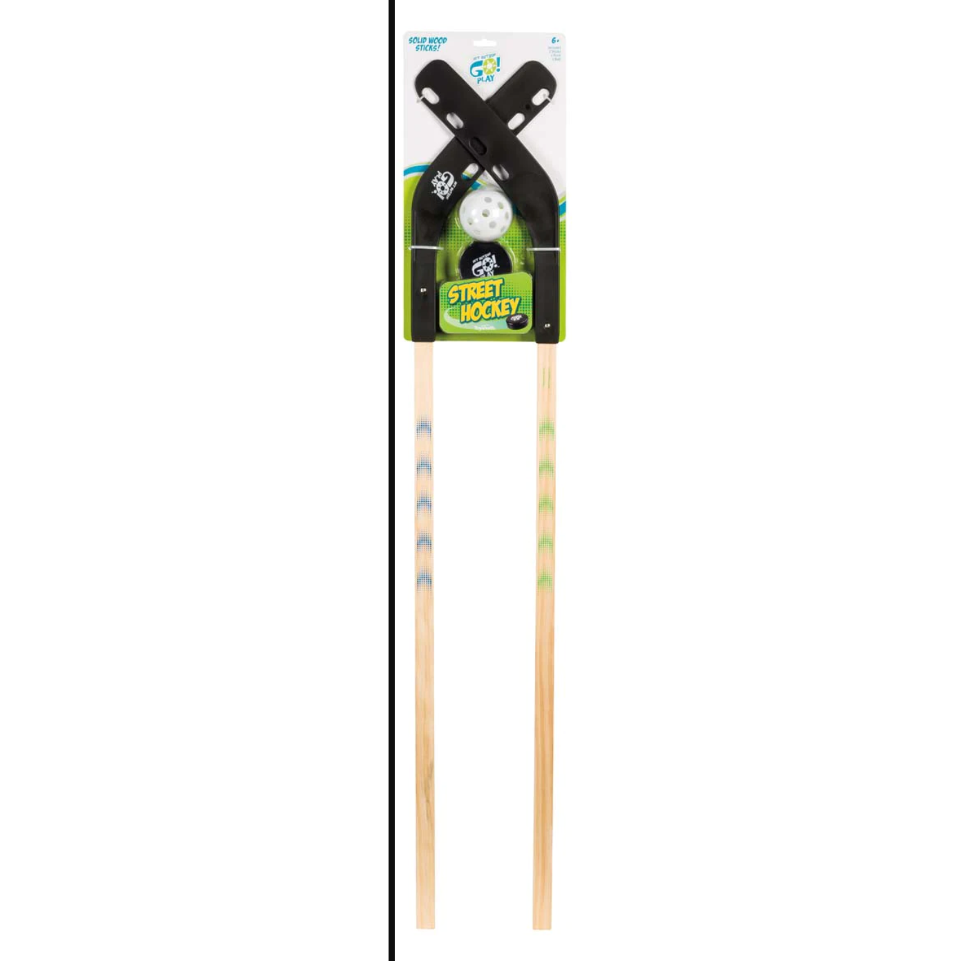 Get ready for street hockey fun with this 2-player set! Includes two 47.5" wooden sticks, a puck, and a Wiffle ball—perfect for outdoor play on pavement or ice.