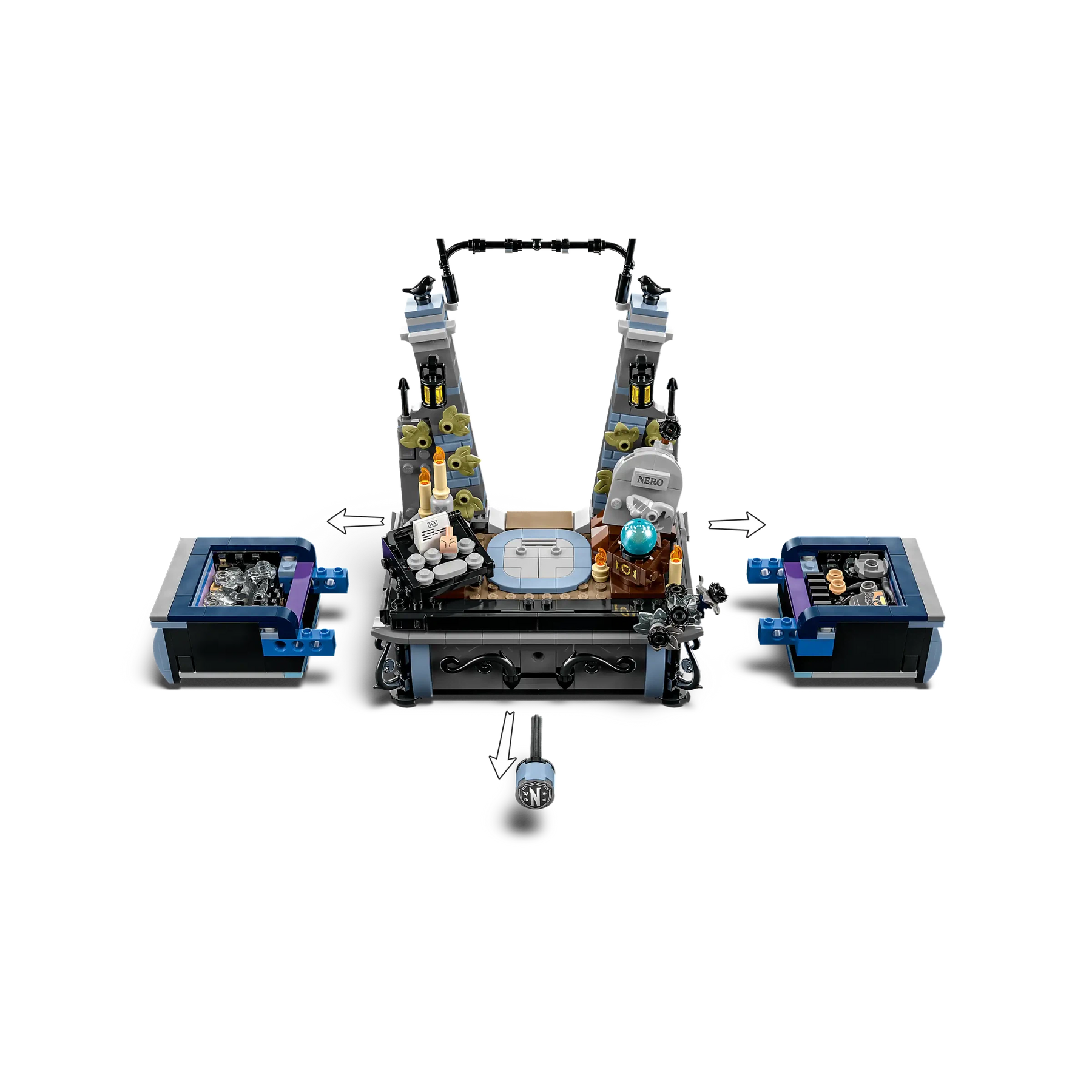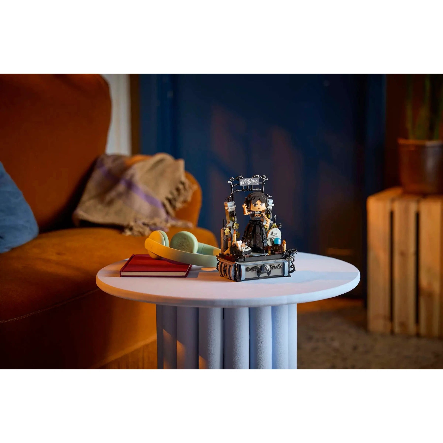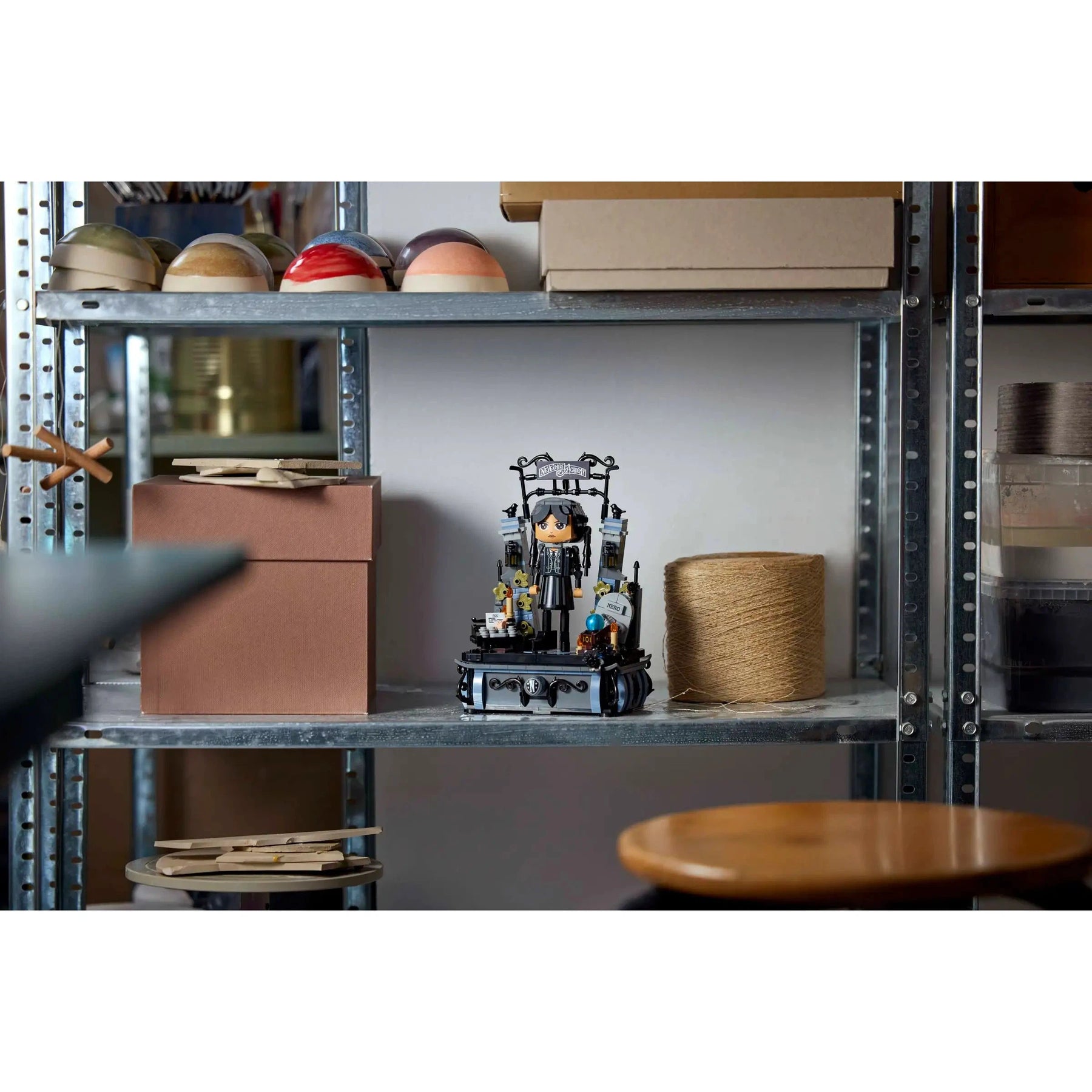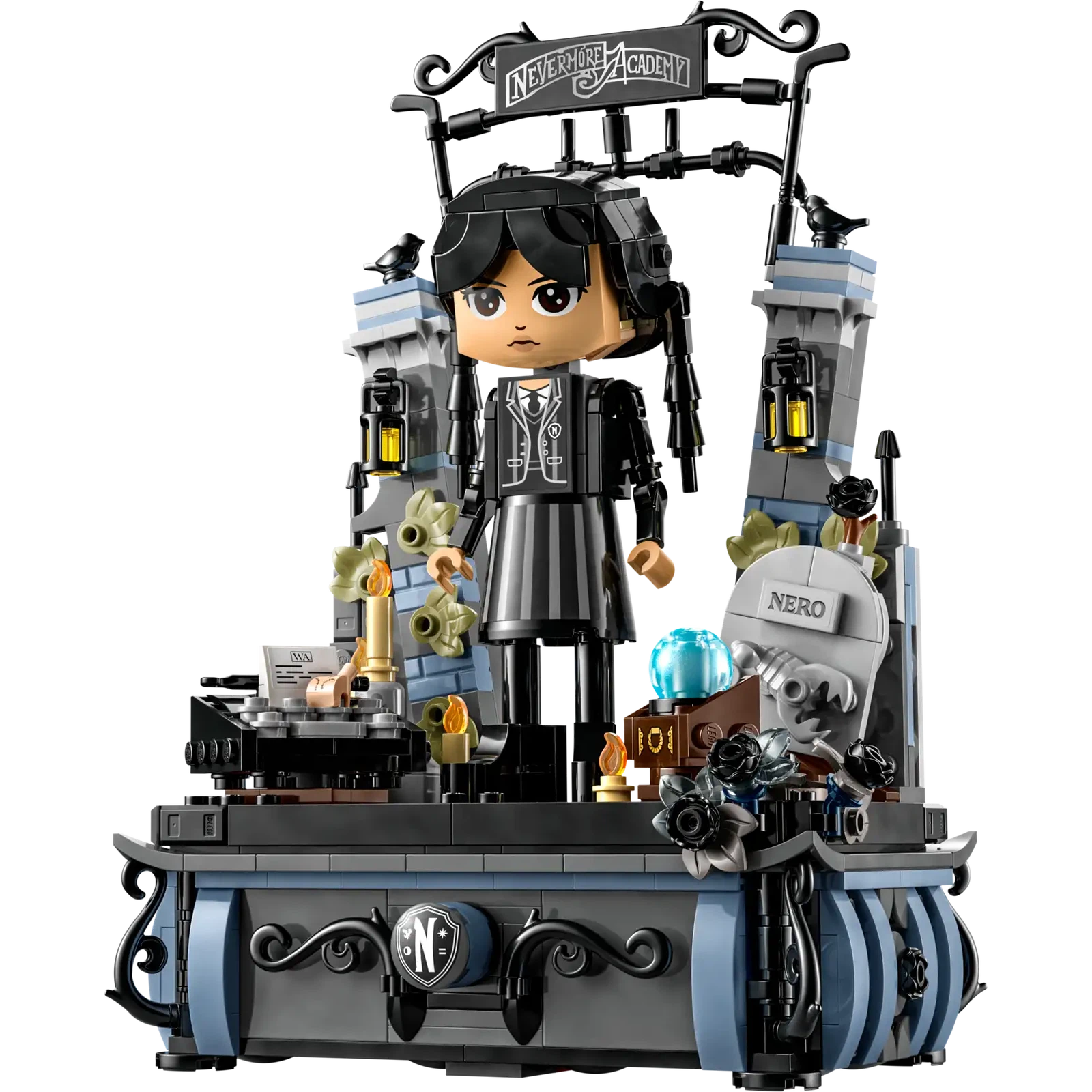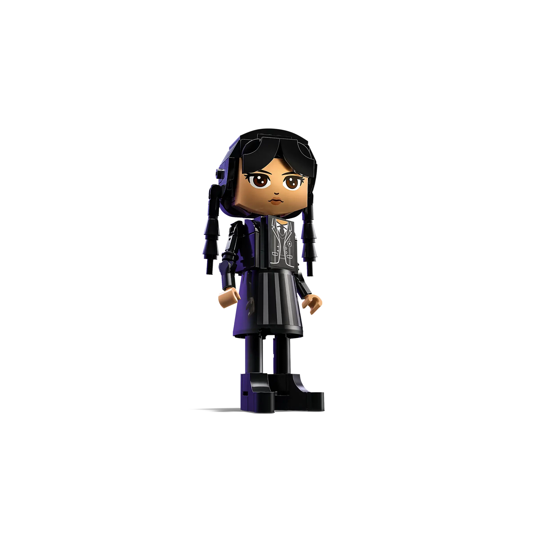 The LEGO® Wednesday Addams (76780) set features a posable Wednesday figure with two faces and outfits, her sidekick Thing, and hidden compartments for treasures. It also includes a Nevermore Academy gate, accessories like a typewriter, Nero's grave, and a crystal ball. Perfect for fans of the Wednesday series!