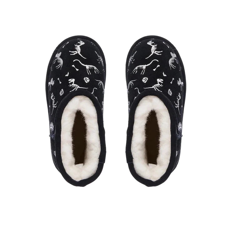 Made for puddle jumping and snowy days, the Reflective Dino Brumby Boot keeps little feet warm, dry, and happy. Fully waterproof and lined with soft Australian Merino wool, these mid-calf boots feature a fun glow-in-the-dark dinosaur print.