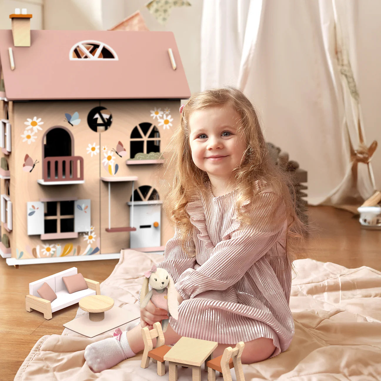 Indulge in the charm of the Flowers Cottage, a beautifully designed wooden dollhouse crafted from FSC-certified wood. Perfect for children ages 3 and up, this elegant, multicolor cottage inspires imaginative storytelling and hours of creative play. Its vibrant design makes it a standout addition to any playroom.