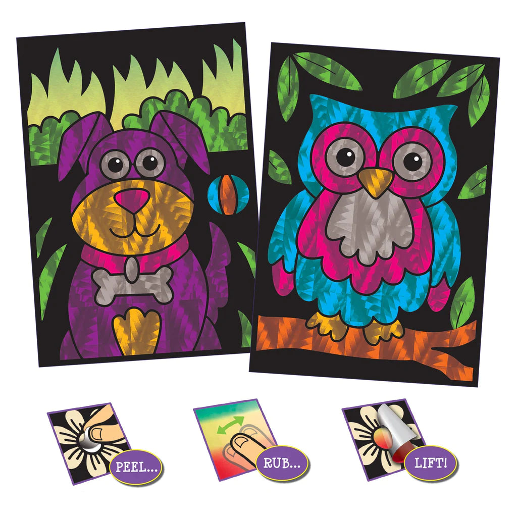 Craft 8 sparkling images with this fab foil art set. Peel off a portion of the picture, lay the foil on the adhesive spot, and rub with your finger. Lift the foil sheet to reveal the sparkly design.