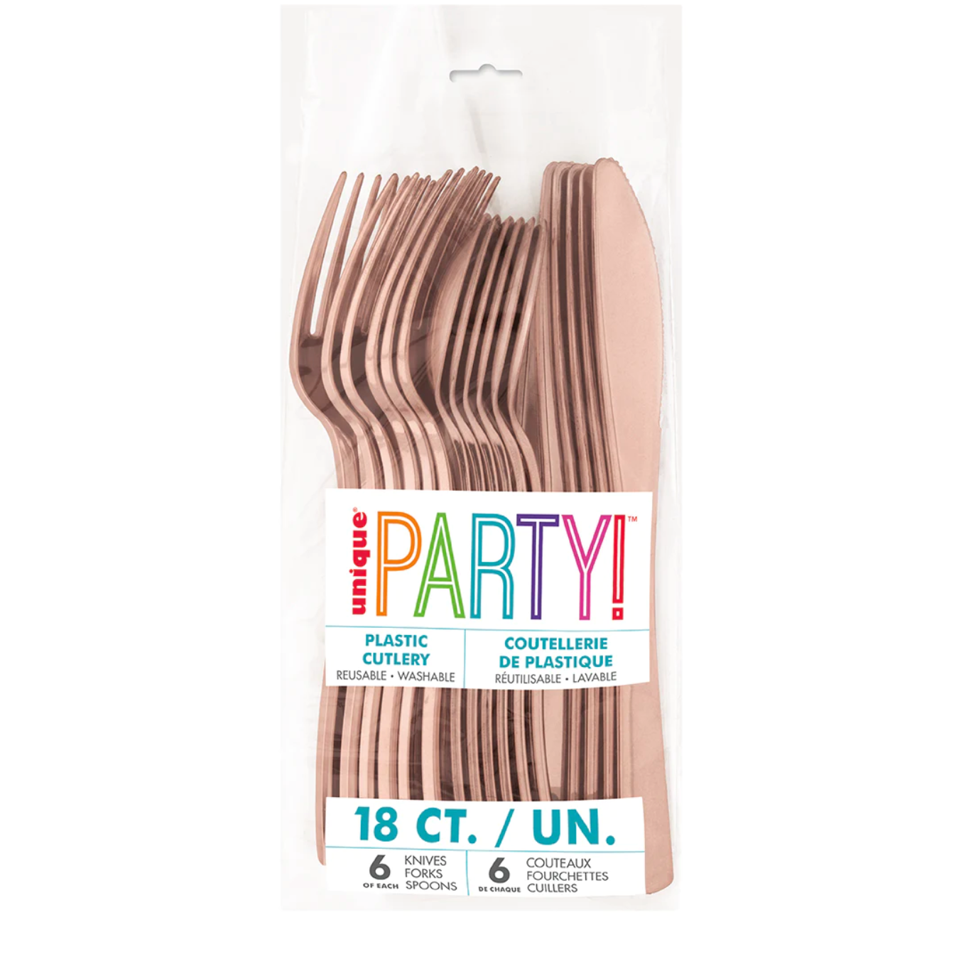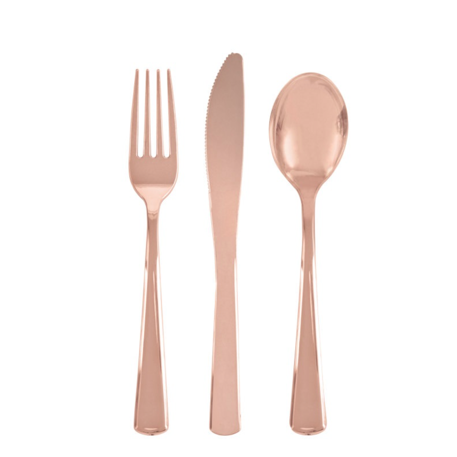 The Rose Gold Plastic Cutlery comes in a pack of 18 and features 6 plastic spoons, 6 plastic forks, and 6 plastic knives all of which are washable and reusable. This Disposable Cutlery would be the perfect finishing touch to any classy event. Quantity Per Pack: - 18 Rose Gold Plastic Cutlery. - 6 Forks. - 6 Knives. - 6 Spoons.