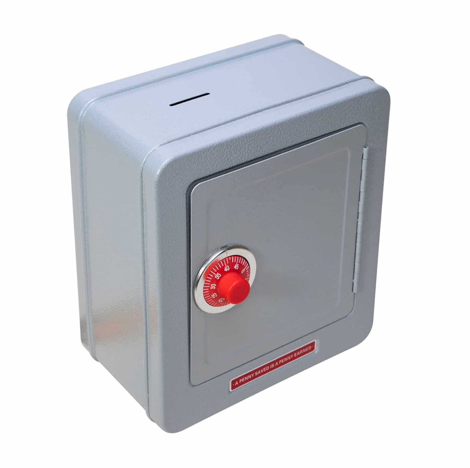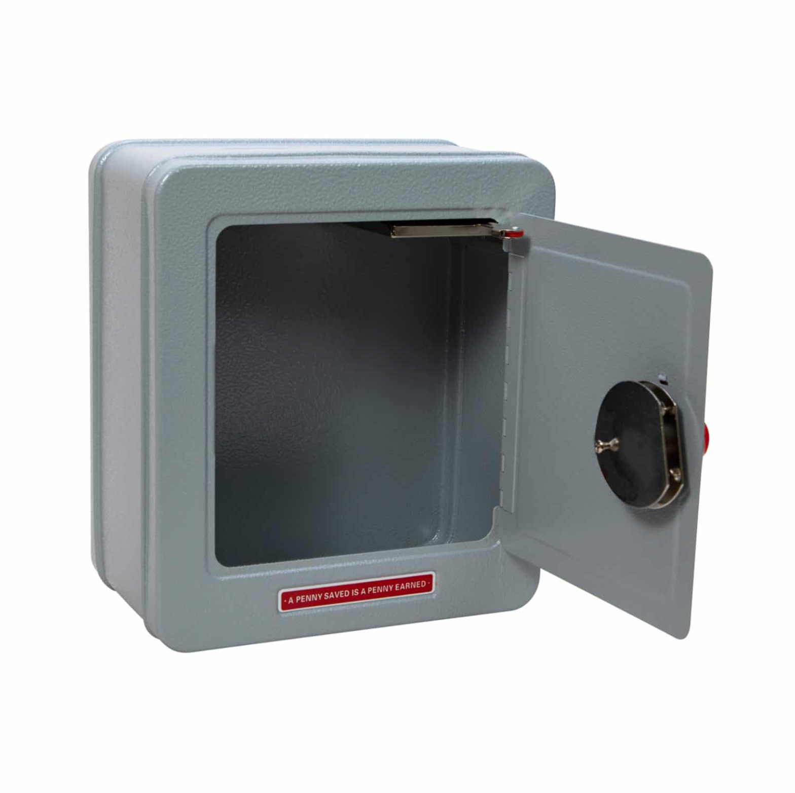 • Solid steel construction with 2 number combination lock, a coin slot on top and a ringing alarm that sounds when you open the door.