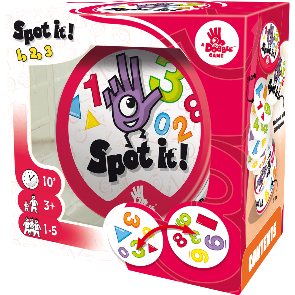 Spot It! 1, 2, 3 adds an educational twist on the family favorite!All of the symbols in Spot It! 1, 2, 3 are a number or familiar shape. With quick, engaging gameplay and multiple variants to play, Spot It! 1, 2, 3 makes for learning fun for the whole family.
